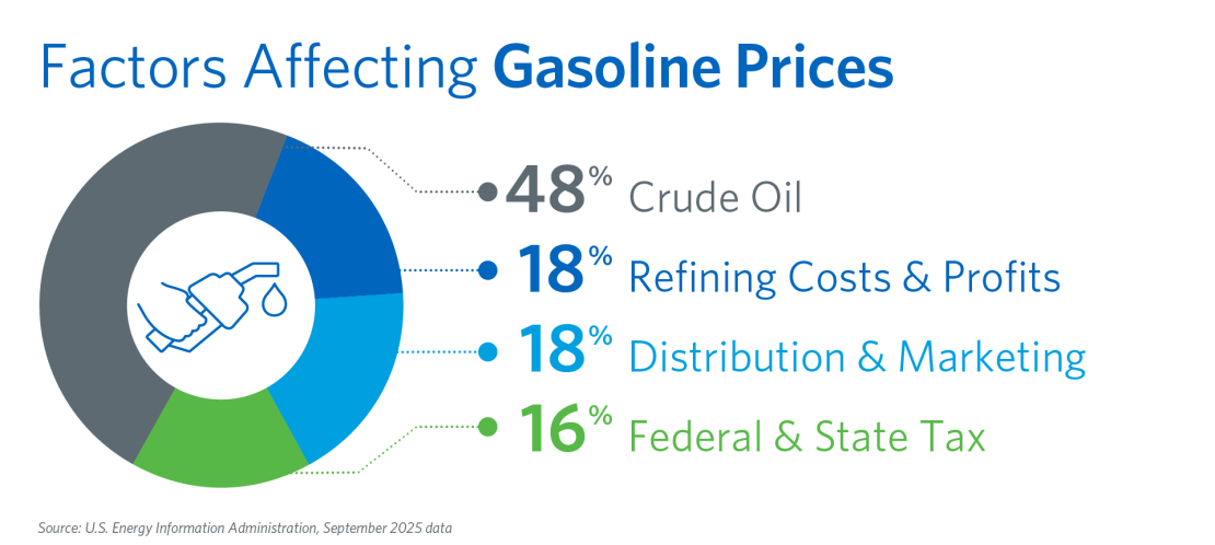 Crude oil is always the top contributor to the prices U.S. drivers see at the pump. Since 2000, crude oil prices have comprised, on average, 55% of the retail price for finished gasoline. Monthly data from the U.S. Energy Information Administration shows that in September 2025 the crude oil percentage was at 48% of the total retail price drivers see at the pump. Source: AFPM visual representation of U.S. Energy Information Administration data