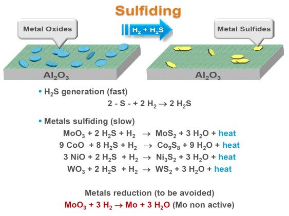 In terms of in-situ catalyst activation (sulfiding), the sulfiding can be done in liquid phase or in gas phase. Further, the sulfiding can be done through injection of a sulfurous agent (e.g., DMDS, Sulfrzol, etc.) or via native feed/sour gas sulfiding, assuming a high enough sulfur content in the feed or sour gas. All these methods are possible, and when completed according to recommended guidelines and best industry practices, with the proper safety and emergency scenarios considered, the catalyst activity and catalyst cycle length has achieved the expectations.