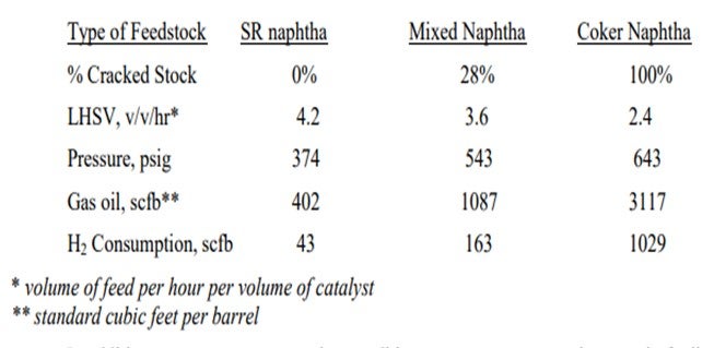 Adding cracked naphtha to a reformer pre-treat unit designed for straight-run naphtha will result in higher hydrogen consumption and increased temperature rises. Often units that previously saw no rise or a temperature loss across the hydrotreating reactor will see a much bigger exotherm. The operating conditions for SR naphtha hydrotreaters are generally much milder than you need for cracked stocks. The more severe conditions for cracked stocks are driven by the generally higher levels of sulfur and nitrogen with more difficult-to-treat types of compounds present. The presence of olefins will greatly increase hydrogen consumption, which will diminish the hydrogen partial pressure and thus decrease the high severity conditions needed for cracked naphtha treating. Some typical operating conditions for straight-run, mixed, and cracked feeds in our system are shown below. The conditions vary widely depending on the actual feedstock and the tolerable cycle length.