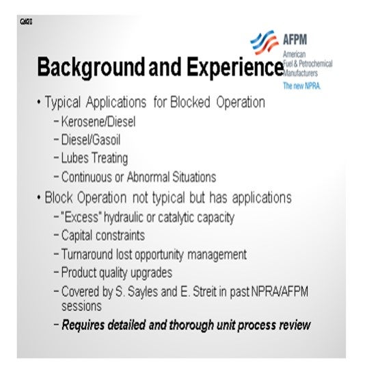 To clarify this question, the term “block mode” relates to the use of a single hydroprocessing unit to operate in at least two different operations, as defined by the feedstock and operating severity. Block mode operation has several applications in the refining industry: