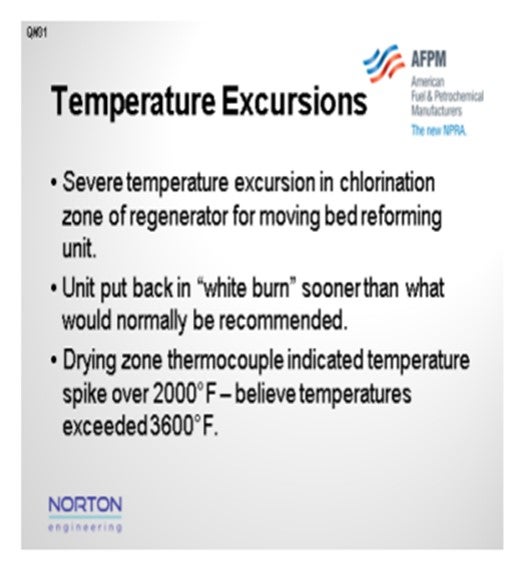 I have three examples of temperature excursions on cyclic reformers. Only the first led to damage, so I will open with that one. This temperature excursion occurred on a spherical cyclic reformer which was going into regeneration about every 10 days. The catalyst section on this reactor has a two-inch layer of refractory. Once we understood the cause of this incident, we realized that coke, over time, had formed between the refractory and the vessel wall. This refractory has a certain number of cracks: not large cracks, but large enough that the hydrocarbon could get behind it and form coke. Also at that time, we were very aggressive with the oxygen target during oxychlorination. That was an actual reactor damage event. Thankfully, it occurred during the regen, so the reactor could be depressured and repaired without any significant safety issue. The follow-up to that, at least in this case, was to limit the O2. Even though we could get better catalyst rejuvenation with high oxygen, we limited it to 2.5%. Our rule of thumb for high temperature burning is that for every one-tenth of a percent of oxygen, we can get another 25°Fof burn temperature. So, imagine that if you are up to 8% or 10% oxygen and there is still coke present, it could get very hot.