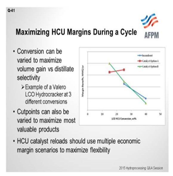My comments are very similar to Scott’s. Conversion is a variable we can use to maximize either volume gain or distillate selectivity. Some of our partial conversion hydrocrackers will actually lower conversion in a maximum gasoline mode to send more unconverted oil to the FCC versus running higher conversion to make more diesel. This chart shows an example from one of the LCO hydrocrackers from a recent catalyst selection at the low crude price now. Lowering conversions on these units, whether with the current catalyst or a new catalyst, provides higher margin at lower conversion somewhere in the 10 to 20% range even looking at different catalyst types. Additionally, cutpoints can be varied to maximize the most valuable products. We have play with diesel endpoints. And then on hydrocracker catalyst reloads, we are using multiple economic margin scenarios for reloads for maximum flexibility. Typically, we will use five or more different price sets; and sometimes, they can yield different answers as to which is the preferred catalyst.
