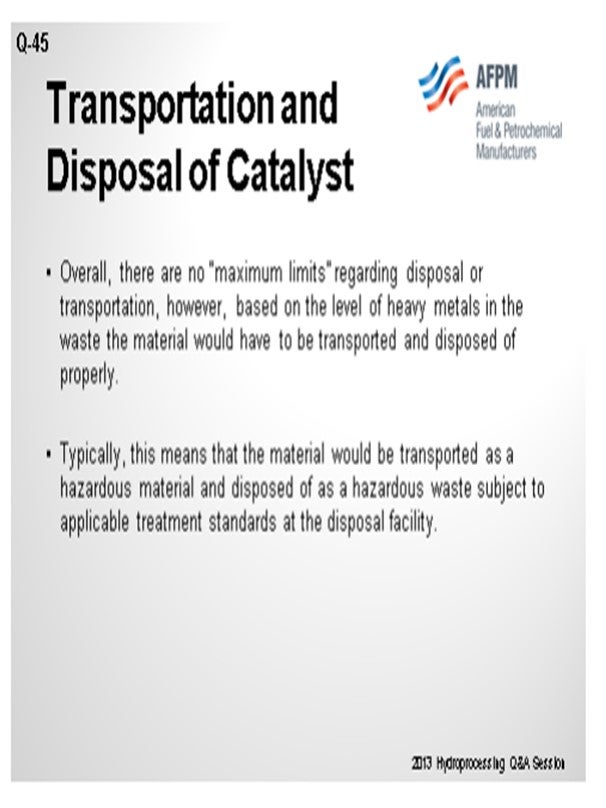 Regarding transportation, if the catalyst needs to be shipped offsite for reclamation, it will have to be determined if it is hazardous material or contains hazardous substance. So by default, spent catalysts generally fit into that category. Take a look at the Hazardous Materials’ Table listed on the slide.