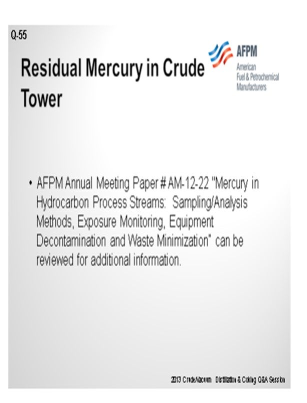 During the online run, not during turnaround, we found mercury in some of the foulants in the overhead and in the naphtha circuits. We have observed this material while blowing down sight glasses or working on a pump or exchangers, so we have become very mindful of the potential for exposure during the turnaround. During the actual turnaround, our Industrial Hygiene personnel conducted monitoring for mercury and found exposure levels well below the concern level. One of our chemical vendors indicated a marked increase in the trend of finding mercury during turnarounds, so that is a very good question. At least one of the vendors has a new technology that includes a chelating agent which lets you remove the mercury from the wastewater collected in the temporary tanks. This was a very novel approach. I do not think that this technology is commercial yet, but I believe it is in the development process.