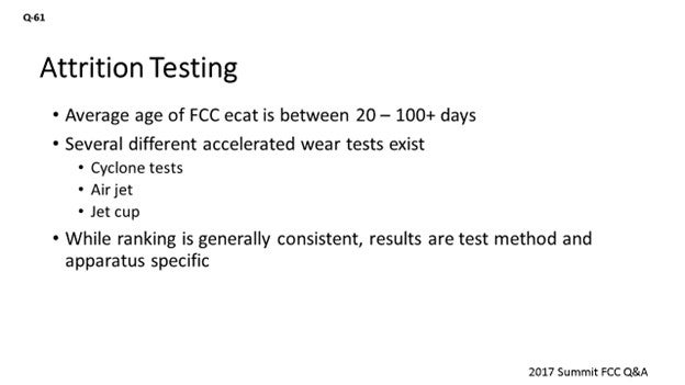 Question 61: When performing catalyst evaluations and considering catalyst resistance to attrition about particulate matter (PM) emission requirements, what new or advanced attrition testing methods are you using to predict the performance of the new catalyst system? Are there third parties who can conduct a standard testing regime to multiple catalyst systems?