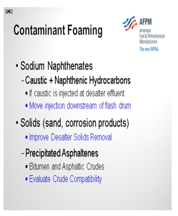 Foaming in flash drums and pre-fractionators is often caused by crude contaminants. Inorganic fines (sand, corrosion products, etc.), precipitated asphaltenes and sodium naphthenates formed from the reaction of caustic and naphthenic hydrocarbons have been identified as precursors. If caustic is injected at the desalter effluent, a simple solution is to move the caustic injection downstream of the flash drum to the pre-flash bottoms or hot train pumps.