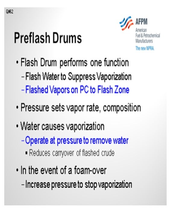 Pre-flash drums are located in the hot crude train downstream of the desalters to flash water and suppress vaporization at the end of the hot train. Flash drum vapors on pressure control are routed to the crude column flash zone. Flash drum pressure sets the vapor rate and composition. Simulations show that water causes vaporization in heat exchanger services at the end of the hot train, not light hydrocarbons. Very light hydrocarbons would overpressure the desalters, if present. Simulations will determine the flash drum pressure required to remove dissolved water from the desalter effluent. The flash drum should be operated at the pressure required to remove water and no lower to reduce carryover of flashed crude. In the event of a foamover, the foam can be broken by temporarily increasing drum pressure to reduce vaporization. Good desalter operation with no water carryover to the flash drum will minimize foaming. Desalters should be operated with less than 0.5% BS&W in the effluent. Prefractionators are typically refluxed distillation columns with an overhead product such as light naphtha and may also have sidecuts. Foaming is less prevalent in a refluxed column. In the event of a foamover the foam front can be broken by first increasing reflux rate and if necessary, temporarily increasing overhead pressure.
