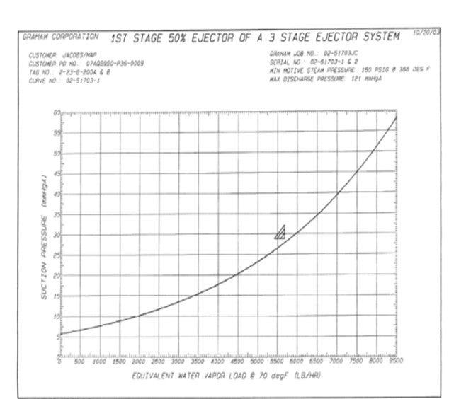 An evaluation of the ejector system starts with the ejector performance curve provided by the ejector manufacturer. This is an example of a performance curve for a first stage ejector, and is typical. The minimum motive steam pressure, with temperature, is listed along with the maximum discharge pressure of the ejector. These two variables must be satisfied before any determination of adequate sizing and optimization can be made. If either the motive pressure is below the design point or the discharge pressure is above the maximum design point, the ejector would be expected to break and not perform as designed. When these two design variables are met, a properly functioning ejector will follow its performance curve.