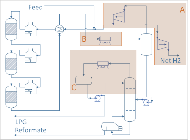 We find that salt deposits form in the compressors, the reactor effluent fin fans, the stabilizer column overhead fin fans, and the stabilizer top trays (see figure Q8 – 1). Process temperature is the largest factor in where the deposits are most likely. There are two approaches the user can take to monitor and mitigate salt deposition. One is proactive the other is reactive.