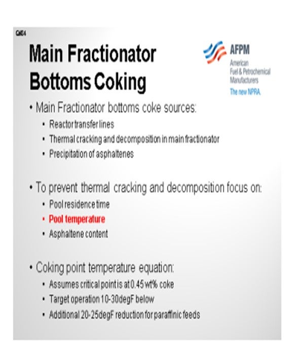 BP has done a significant amount of work internally around the factors that influence main fractionator bottoms coking. Based on a 1988 paper by Total at an AKZO catalyst seminar, the thermal decomposition of DCO is directly related to both residence time and pool temperature. BP used data from this study and additional internal data to regress a relationship between weight percent coke formation in the bottoms, residence time, and pool temperature. Additional studies followed which indicated that FCC feed paraffinicity also has a significant effect on these main fractionator coking reactions. Thus this factor was also added to our regression equation. For our purposes, BP assumes the critical coking point in the main fractionator bottoms at 0.45 wt% coke. The regression equation is solved for temperature at the 0.45 wt% coke level. This temperature is our “coking temperature.” The BP units regularly track the coking point temperature and work to maintain main fractionator pool temperatures 10°F to 30°F below this coking point temperature to prevent main fractionator bottoms coking. Typically, refiners have addressed this by specifying a maximum allowable bottoms temperature which is reduced by 20°F to 25°F for highly paraffinic feeds.