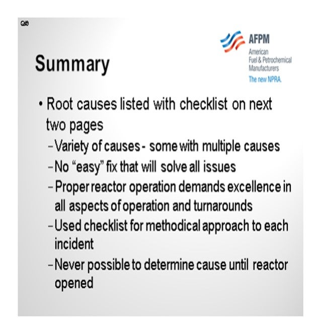 The root causes are listed in a table included with my Answer Book response. To save time, I am not going to go through each one in detail. There are a wide variety of causes for these incidents; and in some cases, multiple causes. This list shows you that there is no easy fix that will solve all of the issues. Rather, there are many steps that must be done with excellence in order to avoid ΔP issues, especially in the planning and execution of turnarounds. A checklist was developed in order to methodically approach and analyze each incident. It was also used to devise action plans to avoid future incidents. In all of our incidents, it was impossible to determine the exact root cause until the reactor was opened and inspected. Basically, we were surprised every time.