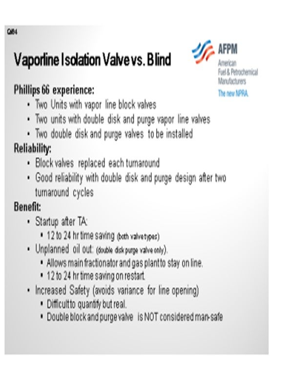 Justifying the benefit of such a valve: You can save anywhere from 12- and 24-hours during start-up. After this slide, I have two more slides that drive home this point. Another advantage is that because the FCC gas plant is often used as a garbage dump for the rest of the refinery, if you do have an outage, you can actually isolate your catalyst section from the main fractionator and keep the recovery section online while doing repairs in your catalyst section. If your site had issues with safety while removing the vapor line blind, such a valve is easily justified. If safety is not deemed justifiable for undertaking this project, then it may be challenging to find another justification. The newer style, the double block and purge valve, is not considered a man-safe device because it relies on a steam purge for positive isolation. All of these newer valves are now being sold with a blank upstream of the valve, which you can then install to make the isolation man safe.