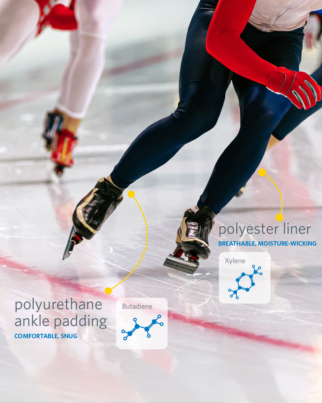 Even speed skaters depend on petrochemicals to keep themselves, well, speedy. Polyurethane ankle padding (made from butadiene) keeps their feet snug and comfortable, while their speed suits include a breathable and moisture-wicking polyester liner.